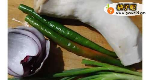 2杏鲍菇用手撕,洋葱切片,辣椒和葱花切小段。