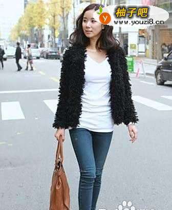 2翻毛绒的外套优雅气质,同样搭配牛仔裤可以让你增加亲近感。