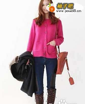 4亮粉色的毛衣十分显眼,搭配牛仔裤与长靴让双腿更显细。