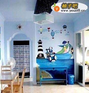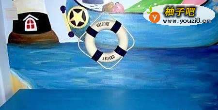 这个客厅最亮眼的就是地中海风格的手绘背景墙,蓝色的基调,以及悬挂的救生圈,更多虚与实的完美结合。