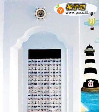 3由两部风组成的门帘,上下两段是厚实滴藏青帆布,当中再覆上一块灯塔图案滴布,然后再镶了三段有特色滴花边,是不是很喜欢。
