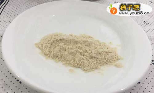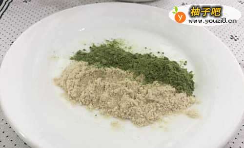 2加入30g左右的燕麦粉,10g左右青汁粉。一边添加温水,一边搅拌