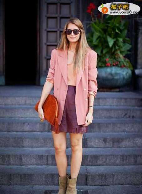 22、这款搭配主打是宽松的粉色西装,却又将这甜美浪漫的粉色穿出了帅气的感觉,紫色的高腰裙搭配翻皮短靴,手拿包和眼镜帅气又不突兀。