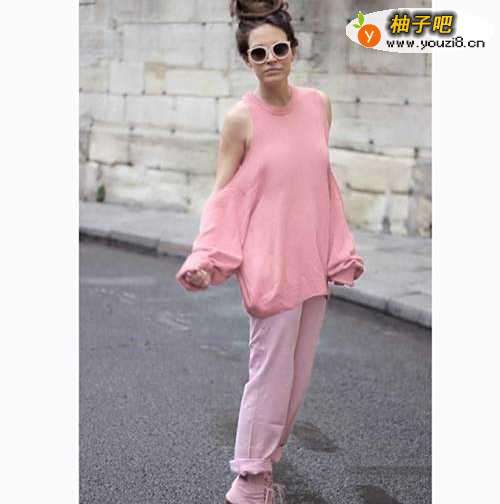 1、这位时尚达人从头到脚选了最爱的粉色,粉色眼镜框,宽大的针织衫同样是粉色,露肩的设计增添几分性感,浅粉色的裤子挽起裤脚,甜美又透着股文艺范。