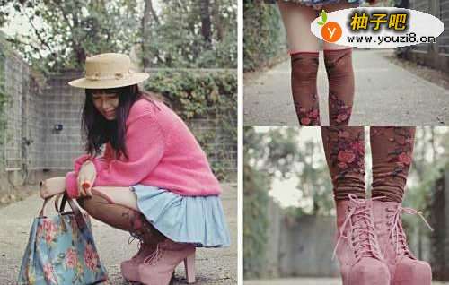 66、粉色毛衣搭粉蓝色蓬裙,可爱中透着一点理性,印花过膝袜和粉红鞋颜色配得很和谐,蓝色印花包包与短裙相互呼应。