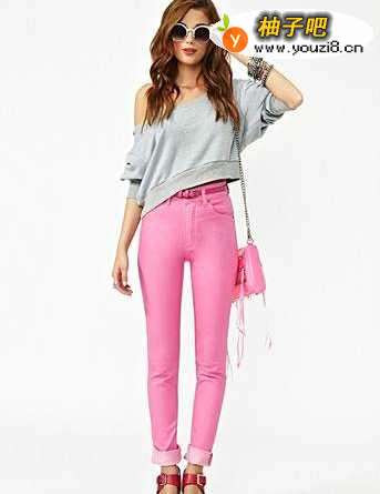 44、这款搭配,玫粉色的高腰裤太亮了,搭配的短款灰色卫衣中和了玫粉色的靓丽,但是露肩的款式让人感觉活力十足。