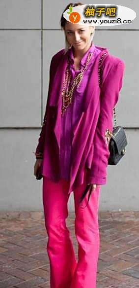 55、这身应该说是玫红色系。搭配很见功底啊,宽松的西服领本身就有层次感,内搭的开扣衬衫金铜色多条项链,裤子提亮了整身的颜色。