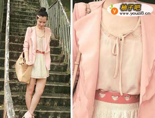 77、这身搭配感觉好甜美啊,淡淡的粉色外套,内搭裸色系带衫,蕾丝短裙,甜美中透着一份知性,丸子头和头上的发带为全身加分不少。