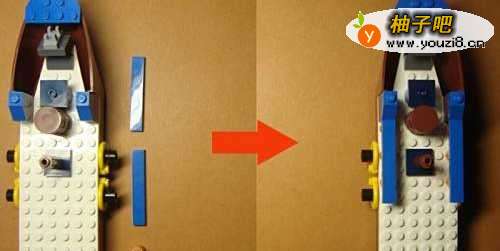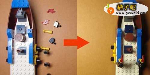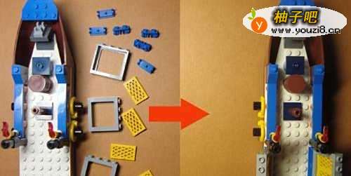 3接着,拼装帆船模型的船舱部分护栏。由四个长形积木和一些零件积木所组成。左边是拼装所需的零件,右边是拼装好后的整体结构效果,如下图所示。