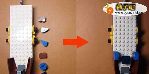 4然后,拼装帆船模型的船舱部分第一层。由两个白色的底板积木和一些零件积木所组成。左边是拼装所需的零件,右边是拼装好后的整体结构效果,如下图所示。