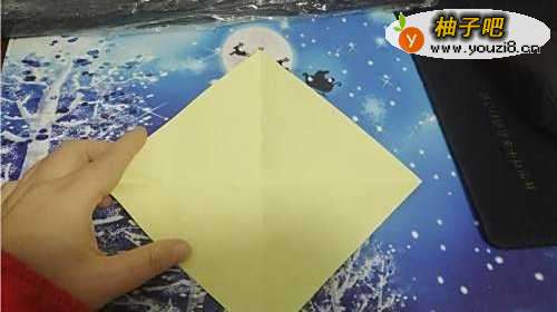我们先把彩纸的两角对折,我使用的纸是单色的,效果不是很好。