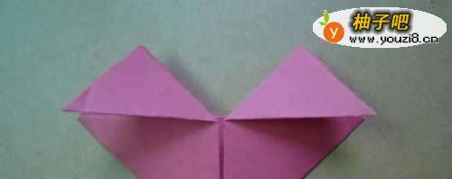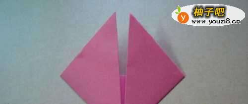 4接着,将红色折纸左边三角形向左折,右边三角形向右折,