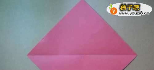 取出红色的彩纸裁成正方形,接着旋转90度,上边三角形向折痕对折一次