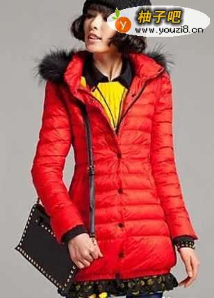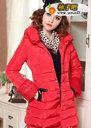 2中长款蕾丝花边修身红色羽绒服,很经典的版型,修身拉长身材比例,搭配黑色或是豹纹围脖内搭黑色针织衫打底,颜色跳跃活泼,经典的黑红配色让你瞬间成为时尚达人。