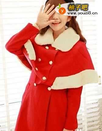 5非常亮眼的红色大衣,白色的毛领加入,与红色想成鲜明的对比,丰富了视觉感受哦!斗篷的加入,更加的可爱!