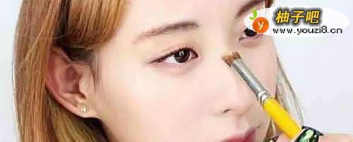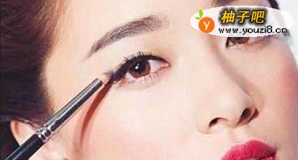 韩国妆的眼影通常隐藏于粗黑的眼线之下,并不明显。韩妆的眼影色取材于粉、棕色系的唇彩,用尖头小眼影刷蘸取适量轻涂于眼线周围1毫米至3毫米处,再补一层定妆粉,以创造出整个眼部略微凹陷的立体感。