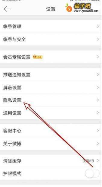 4这时就会弹出微博的设置页面,在页面中点击“隐私设置”的菜单劫裁项。