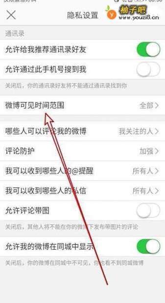 5然后在打开的隐私设置页面中,找到“微博可见时间范围”的菜单项。
