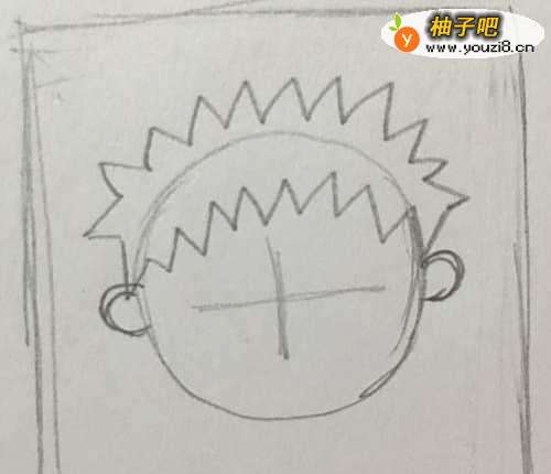 4然后画出耳朵,在脸中间做一个十字,水平线与耳朵平行。