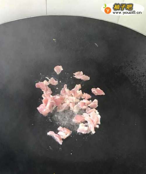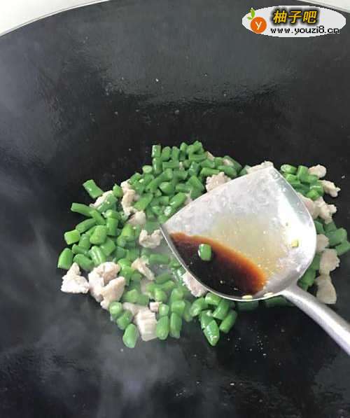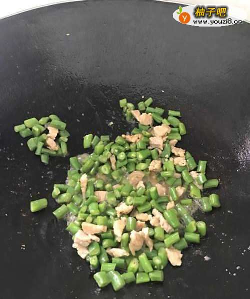 5炒锅烧热,放入油,接着放入猪肉煸炒。然后倒入四季豆翻炒均匀。