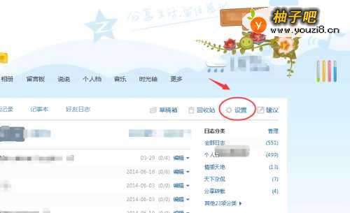 4在您的qq空间日志页面的右侧,找到“设置”点进去。