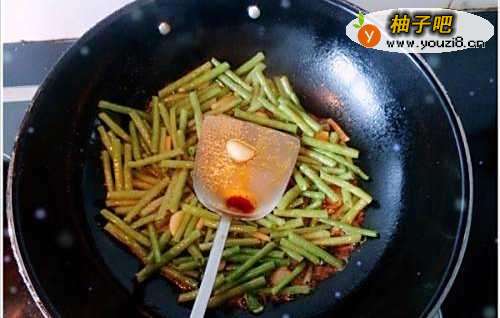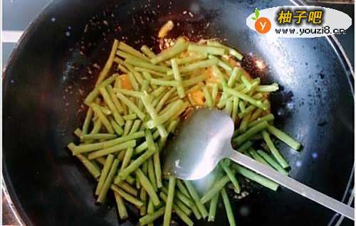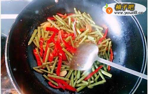 5然后放入焯好水的豇豆不断的翻炒,过一过热油,味道会更香。焯好水的豇豆可以放入冷水中冷却一下,然后沥干水分再放入锅中进行爆炒。