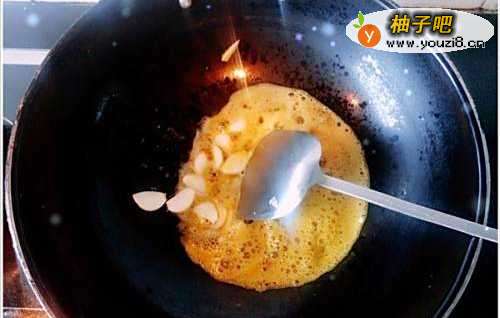 4锅烧热放油,待油温热后放入切好的大蒜片爆香。因为我用的是菜籽油,所以特别容易起沫。但是菜籽油是纯植物油,吃了对身体比较好。