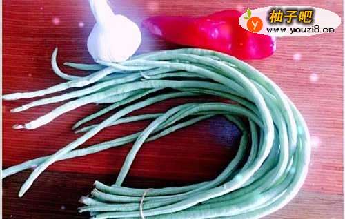 准备所需食材:新鲜的豇豆一斤左右、红甜椒1个、大蒜头1个。现在新蒜头已经上市了,大家可以买来尝尝,我觉得新鲜的蒜头吃起来还蛮好的。
