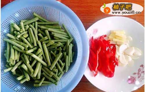 2处理食材:豇豆掰成段洗净备用、红甜椒洗净切丝备用、大蒜瓣切片备用。豇豆最好是用手一段一段的掰,这样能把有虫眼的地方全部挑选出去。
