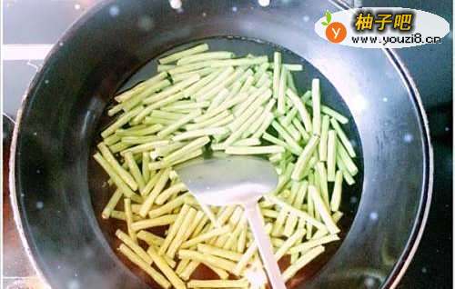 3豇豆焯水:锅内加入水烧热,把准备好的豇豆放入焯水两到三分钟,断生即可,不要煮的太熟了。豇豆焯水后我们再炒的话就容易熟的多了。