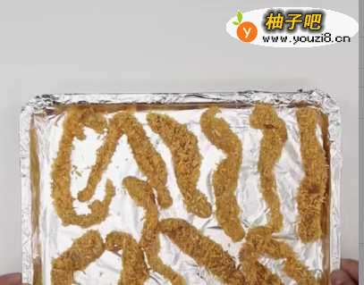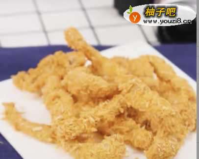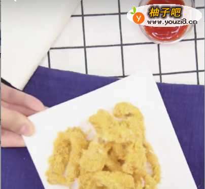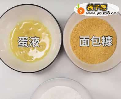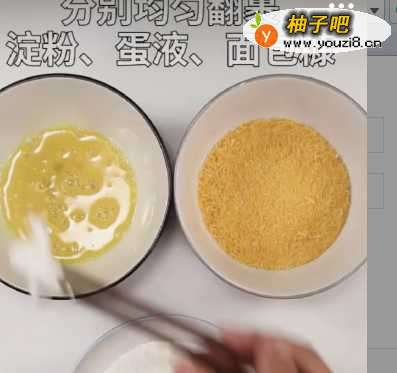5把鸡柳依次粘上淀粉,鸡蛋液和面包糠