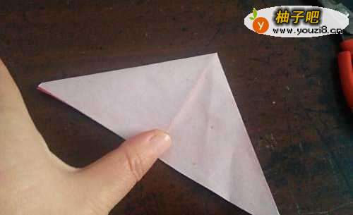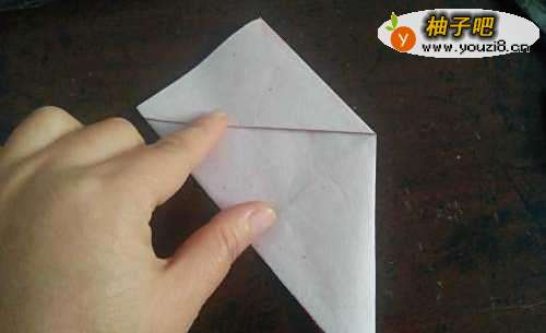2我们把底边的两个角相互对折,打开后,再把上边角向着手指的位置对折,如图。