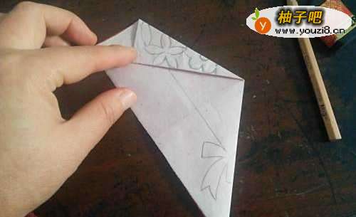 准备好一张正方形彩纸,一把剪刀,笔。先把彩纸的两角对折,如图。