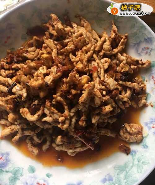 3第三步,起锅烧油,油热后放豆瓣酱,炒出红油,放肉丝,快速翻炒至变色出锅