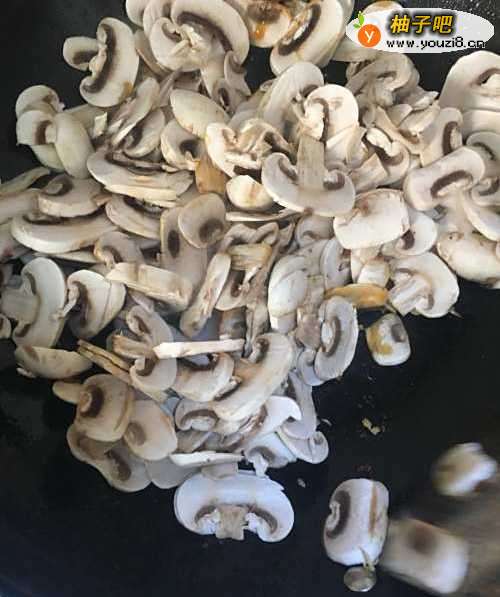 4第四步,锅中留油,放姜蒜炒香,放口蘑翻炒至变软