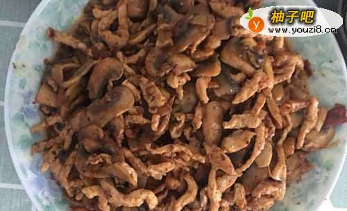 5第五步,口蘑炒软后加入之前炒好的肉丝,加盐、酱油、鸡精翻炒2分钟后出锅即可