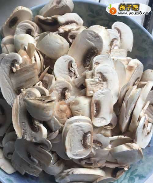 2第二步,将口蘑洗净后切片,姜蒜切末备用