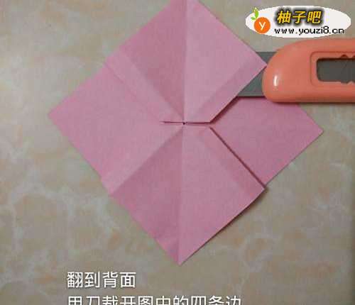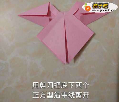 12用剪刀把底下两个正方形沿中线剪开,注意不要剪到背后的中心正方形