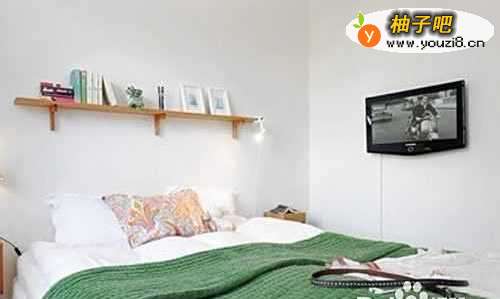 无论是小巧的床头柜,还是床头上实用的木质搁架,卧室的家具全都采用了北欧式的简约风格设计,显得干练且利落。而卧室整体的色彩搭配也是时尚和谐,一块清爽的绿色床品则提亮了卧室的整体色调。