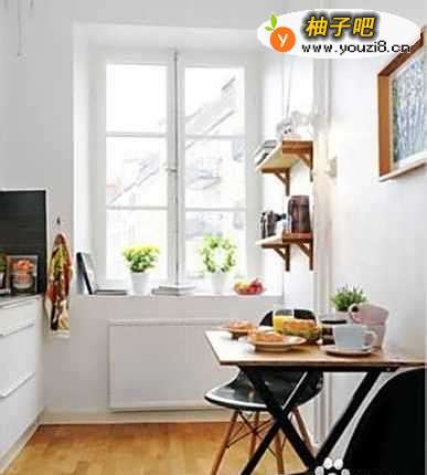 6这个由原木色、白色和黑色构成的餐厨区,展现了质朴原味的空间风格。一张仿旧的木桌靠墙放置,自然的味道油然而生。黑色座椅的点缀与黑色的料理区背景墙相互呼应,空间中随处可见的绿色盆栽,则让自然的气息更为浓郁。