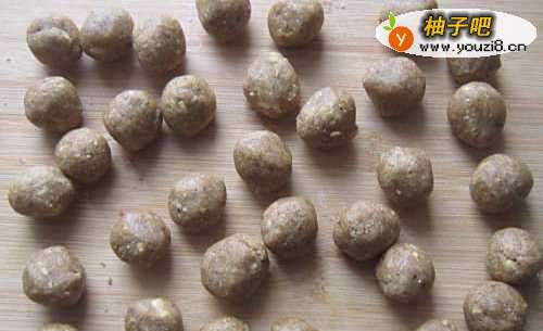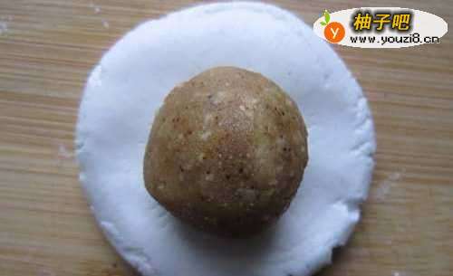 9将面团搓成长条,再分成小剂子,每个小剂子都揉成小球并按扁,然后将馅料放上去