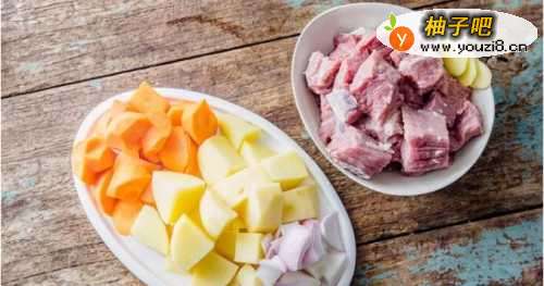 1、处理食材:土豆和胡萝卜去皮,土豆切大块,胡萝卜切滚刀块,洋葱切片。牛腩切块,切姜片备用。自家吃的牛腩可以切大块一些,保持内部更多的水分,小块容易老。