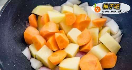 22、炒配料:热锅倒油,倒入前面切好的土豆、胡萝卜、洋葱,用中火翻炒。炒到土豆和胡萝卜表面有点焦黄,捞出盛盘备用。