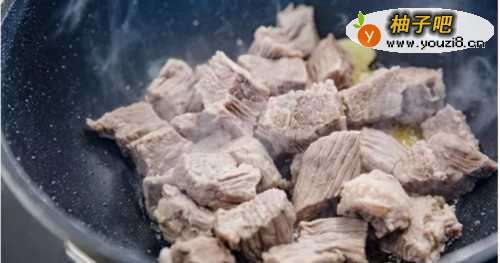 55、姜片放入锅中爆香。倒入前面处理好的牛腩,中火翻炒两三分钟。
