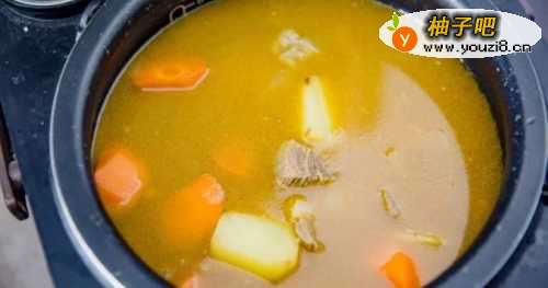 88、炖牛腩:牛腩连汤倒入电饭煲中,开启煲汤功能。没有煲汤功能就用煮粥功能。炖2小时左右加入前面处理好的蔬菜。