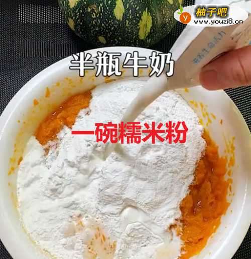 2●第二步:将蒸熟的南瓜放入盆中并捣烂做成南瓜糊,继续倒入半瓶鲜牛奶以及一碗糯米粉。