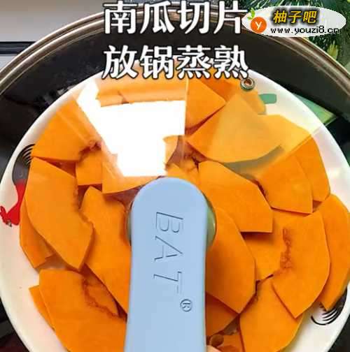 ●第一步:将备好的南瓜去皮切片,放入蒸锅中蒸熟。