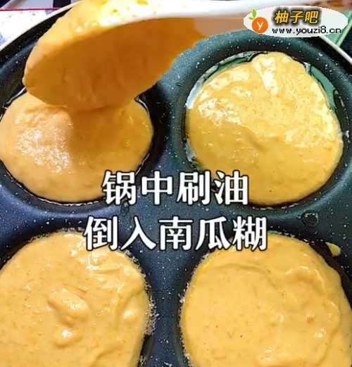 4●第四步:在烙锅中刷油并倒入南瓜糊。
