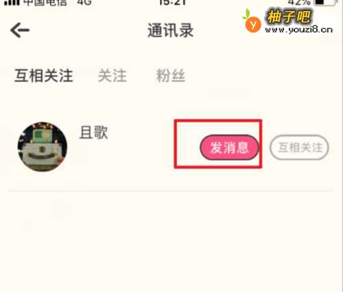 3在互相关注界面,我们点击页面中的发信息的选项,进入好友的聊天界面。