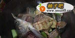 5炒锅中放油,烧热,将鱼等放入,炒一下。如果要吃辣的,油热后放入火锅底料,熬化,再放入鱼,炒一下。